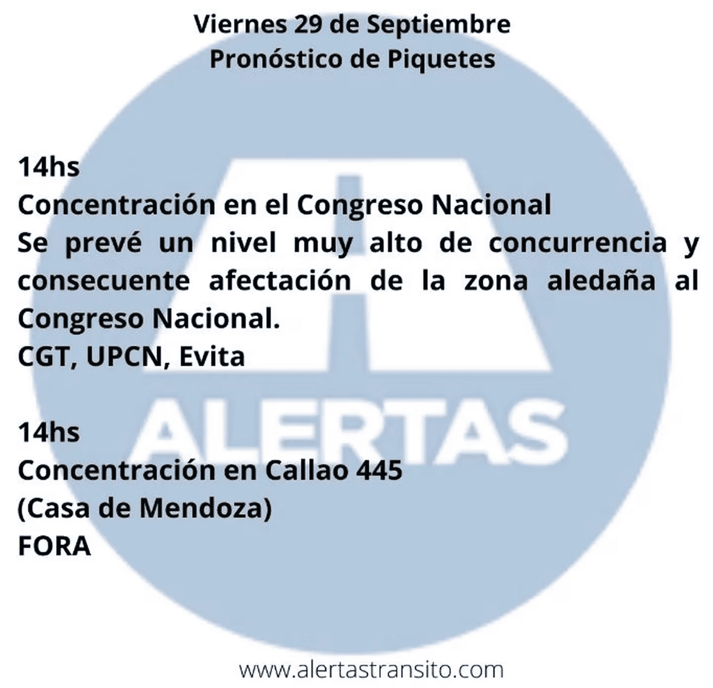 • 14:00 – Concentración en el Congreso Nacional por parte de la CGT, UPCN y Movimiento Evita. Se prevé un alto nivel de concurrencia que afectará también a las zonas cercanas);